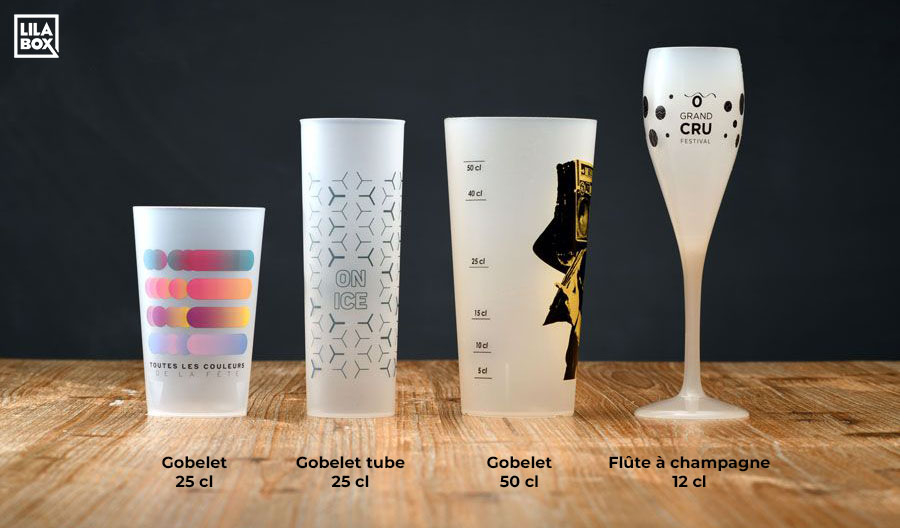 Pour votre événement, LILABOX vous propose les gobelets réutilisables et personnalisables qui deviendront de véritables objets de collection. La période du gobelet jetable est révolue. Notre produit s’inscrit dans une démarche durable rimant avec réutilisation et recyclage. Il évite la surconsommation de déchets et donne vie à de nombreux moments conviviaux. Les boissons coulent à flots dans un gobelet thermorésistant et incassable !
