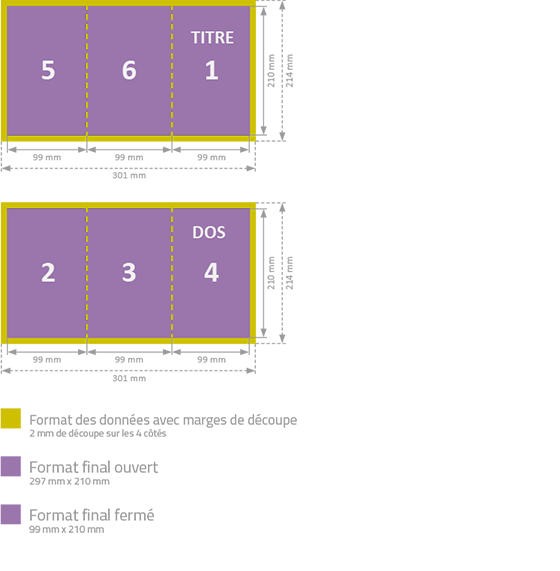 Format du fichier à fournir : 21 x 29,7 cm + 2 mm de fond perdu pour la coupe.