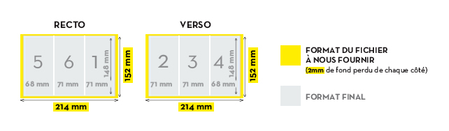 Format du fichier à fournir : 14,8 x 21 cm + 2 mm de fond perdu pour la coupe.